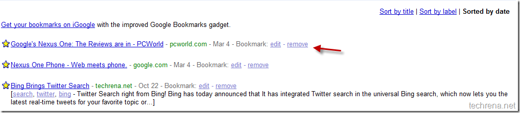 First of all, removing an item from Google bookmarks is really simple, what all required is to go the Google bookmarks page (https://www.google.com/bookmarks/), find the small ‘remove’ link next to your starred bookmark entries.