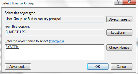 5. Now go back to the “General” tab and click on the “Change User or Group..” under the Security Options. Type “SYSTEM” as the object name and click OK.